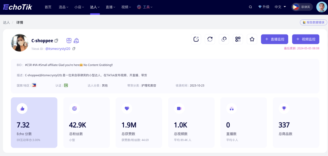 在上线菲律宾TikTok Shop的短短4个月内,其日均销售额就达到了5000美金。如今半年不到,它的月GMV已经达到约480万比索(折合美金约8.38万),销量超过2.2万件。