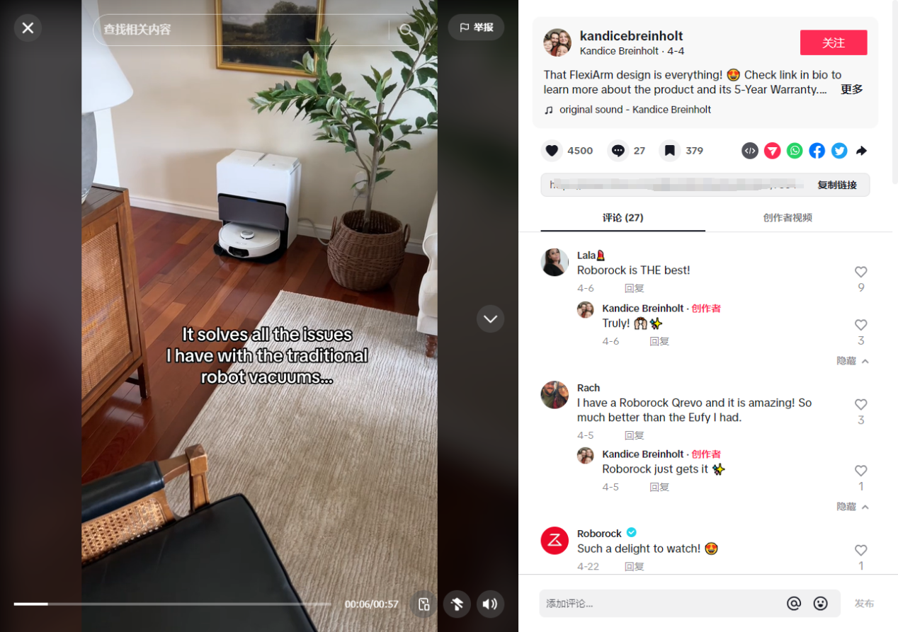 甚至在不同国家和地区,石头科技还设立了不同的官方账号,输出差异化内容。例如,在TikTok平台上,石头科技会发布针对各地用户需求的本地化内容,通过与当地KOL和红人合作,将产品推广到更广泛的用户群体。