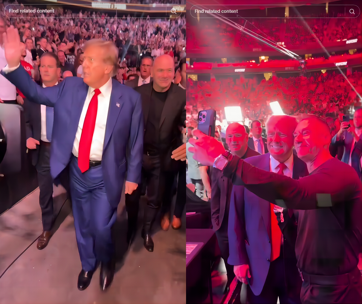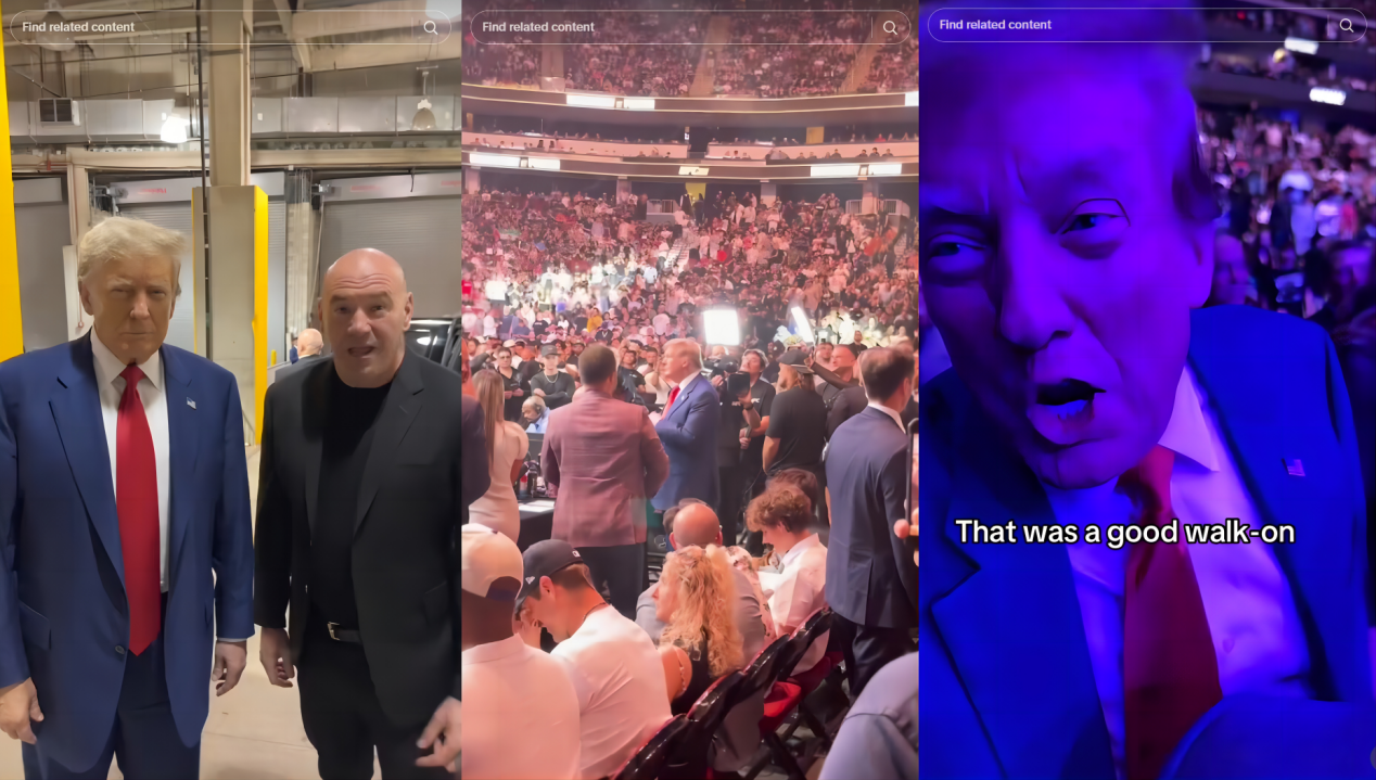 镜头里,特朗普出现在了终极格斗冠军赛综合格斗赛事的现场。