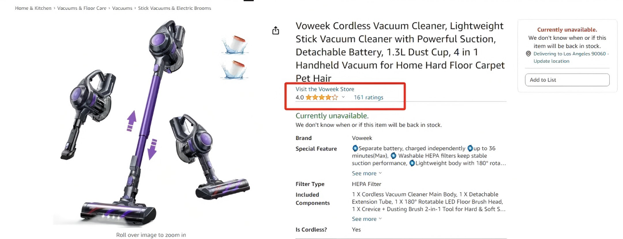 而在此类目中,一款名为“Voweek "的无绳吸尘器,以售价43.99-79.99美金的价格,单周卖出7771件,一跃成为家电类目榜首。