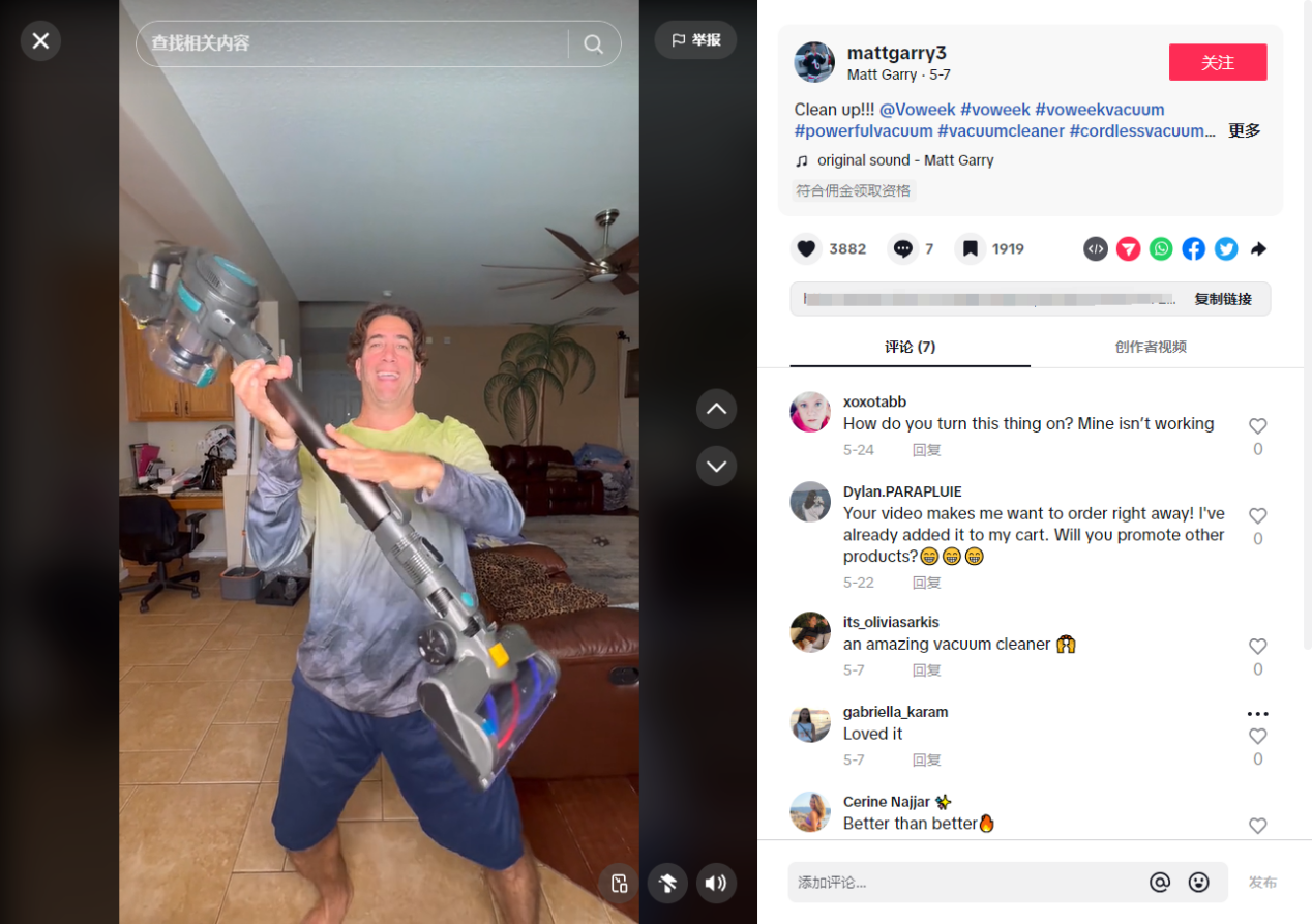 吸尘器产品本身,就是人们日常用的电器之一,Voweek的短视频就是从日常出发,通过产品的多场景应用,吸引买家的注意。