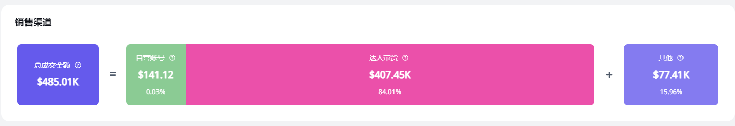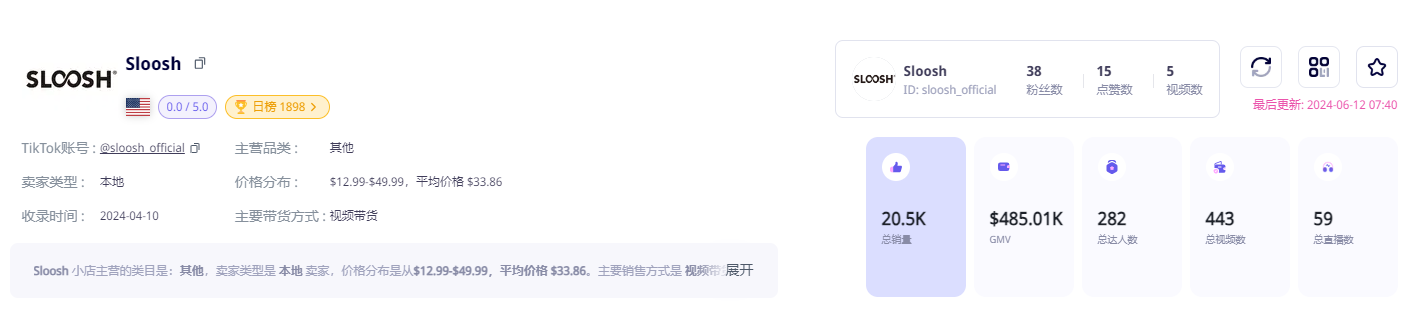 在运营策略方面,@Sloosh主要通过达人短视频来带货。数据显示,该店铺的销售中,84.01%来自于达人带货,合作的达人超过282人,总视频数超过443个,并参与了59场直播带货活动。这些带货达人主要集中在数万至数十万粉丝区间,其中几位百万级别的网红也参与其中。