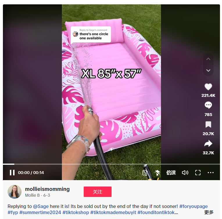 值得注意的是,一位名为@Mollie B的博主,仅凭一个14秒的介绍视频,就达到680万的播放量,预估销量达2000件以上,预估GMV达6.92万美元。这充分展示了精准内容营销的强大威力。