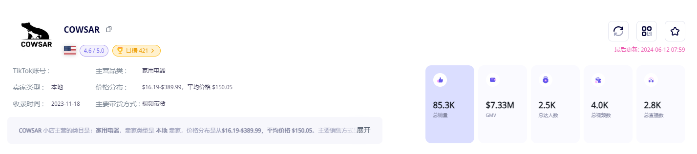 除了充气泳池,家用制冰机也在夏季迎来了销量高峰。小品牌COWSAR专门售卖各种容量、价位和功能的制冰机,在近期销量增长迅速。该店铺总销量达8.53万件,GMV高达733万美元,建联达人超过2500人,并参与了近3000场直播。