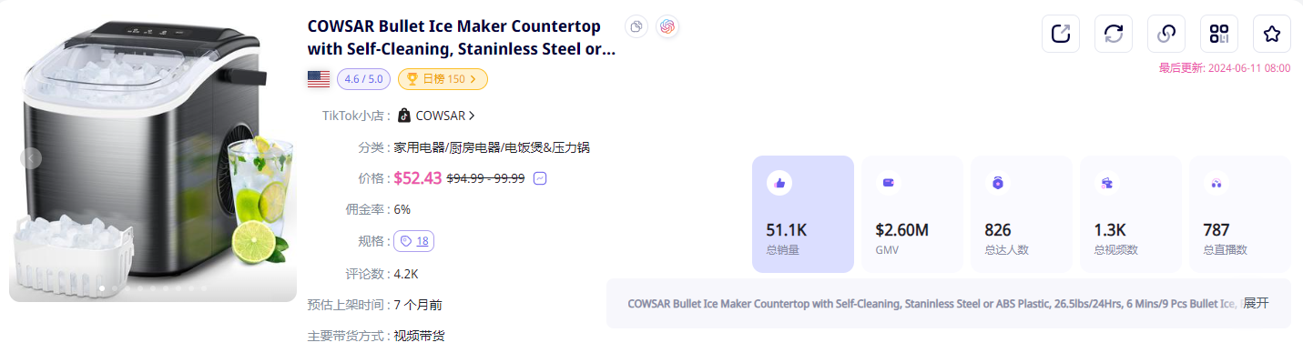 COWSAR的一款子弹型制冰机成为店铺销量的Top1单品,售价52.43美元。最近30天销量达2.42万件,占总销量的50%左右,GMV达127万美元。视频内容主要展示制冰机的使用方式和冰块效果,简洁明了的操作演示,加上低价和限时折扣的促销策略,大大促进了成交。