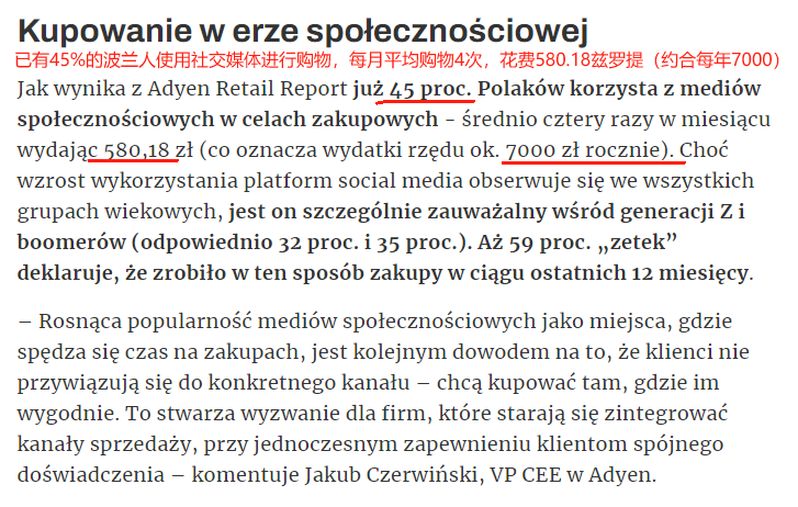 据Adyen发布的一份研究报告显示,2023年,有45%的波兰消费者通过社交媒体平台购买他们喜欢的产品,每年花费约7000兹罗提,折合约12535.85民币。