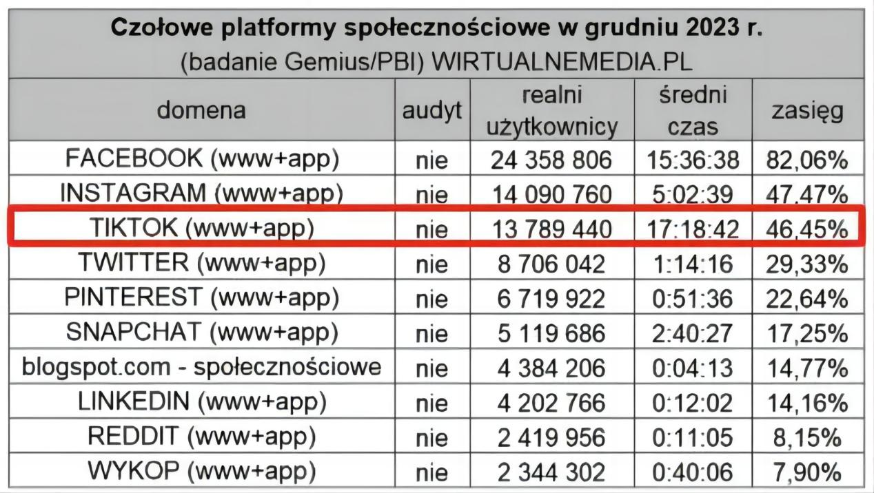 根据Mediapanel发布的统计数据可知,截至2023年12月,TikTok在波兰的用户数量超过1378万,占比46.45%,这意味着近一半的波兰互联网用户都在使用TikTok。