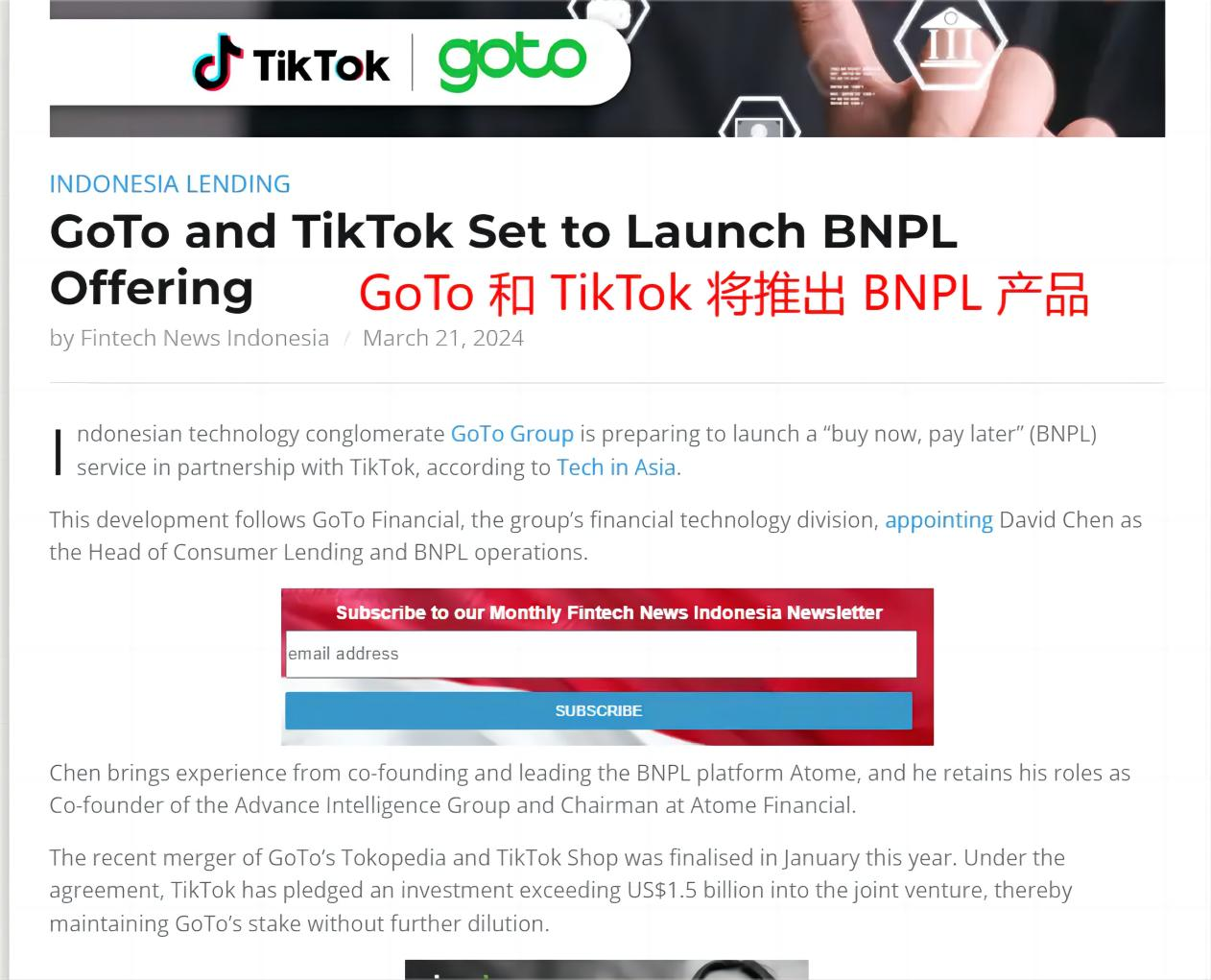 来到今年3月,全球现象级短视频平台TikTok与印尼科技巨头GoTo集团达成合作,计划在印尼推出先买后付服务,进一步提升购物体验与平台吸引力。
