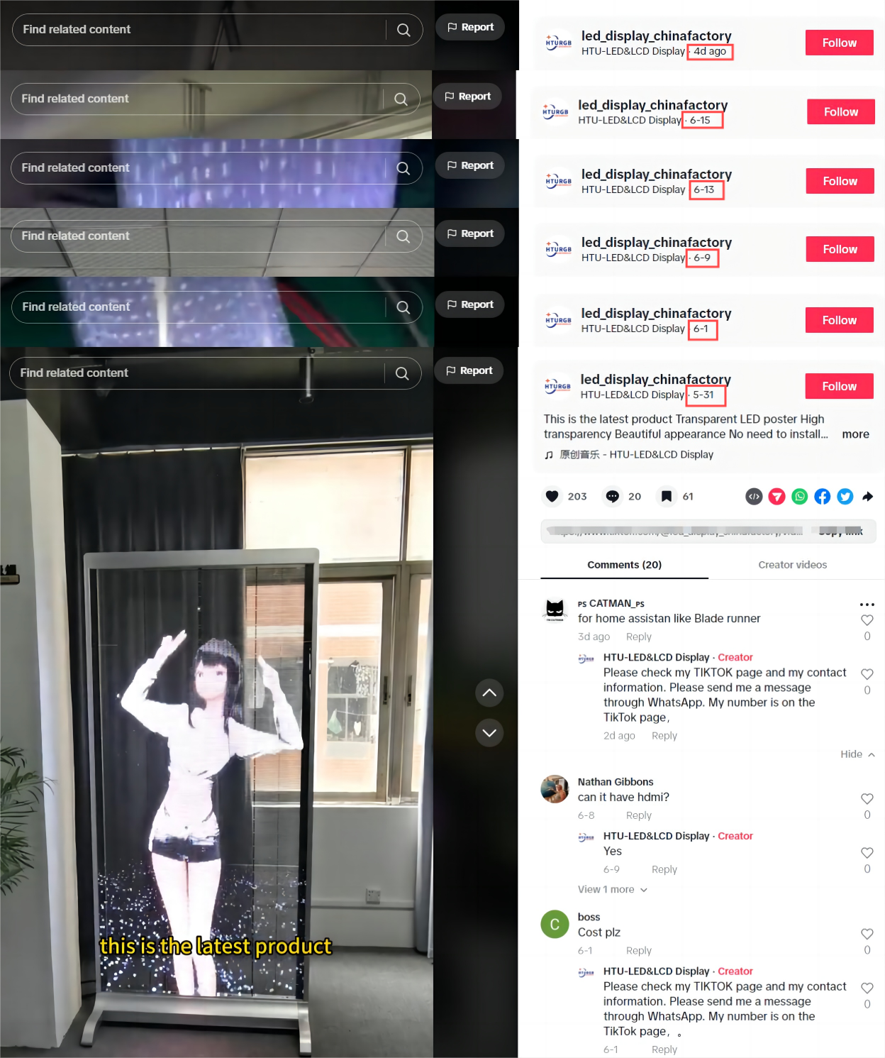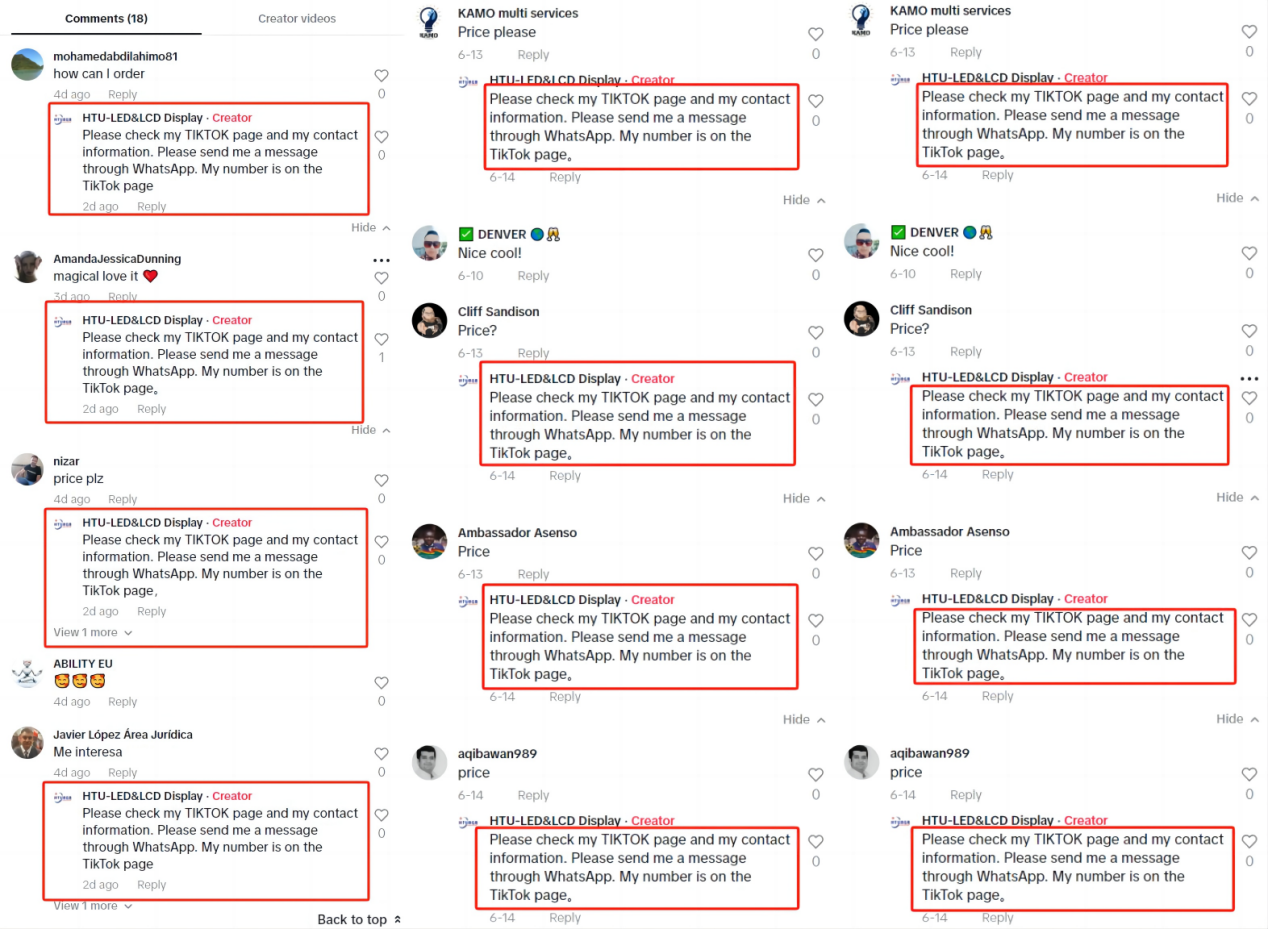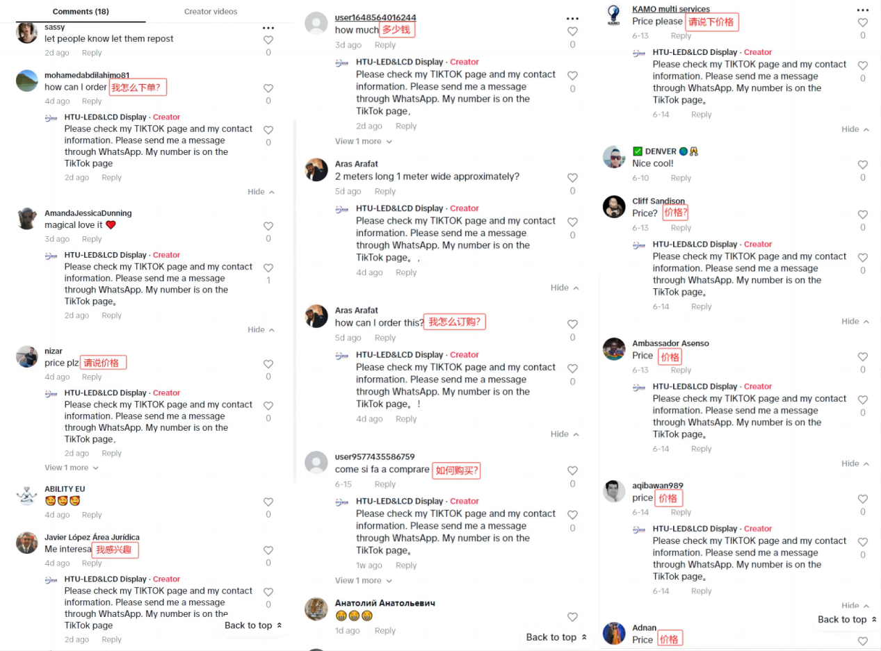 在播放量持续升高的同时,这家LED显示屏工厂前来询盘的人数也越来越多,许多客户都在他们视频的评论区留言,询问显示屏的价格是多少?要怎么订购?远的不提,单从下图中近期的留言内容来看,便可以看到这家LED显示屏工厂的生意有多红火,可谓前来询盘的人不断。