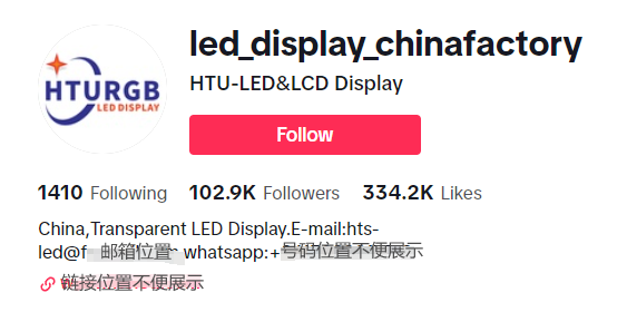 这家LED显示屏工厂在TikTok主页上挂载了多种联系方式,包括电话、邮箱和官网链接,方便了潜在客户快速地联系到他们,一方面提高了联系效率,一方面促进了客户转化,同时也增强了用户的信任感。