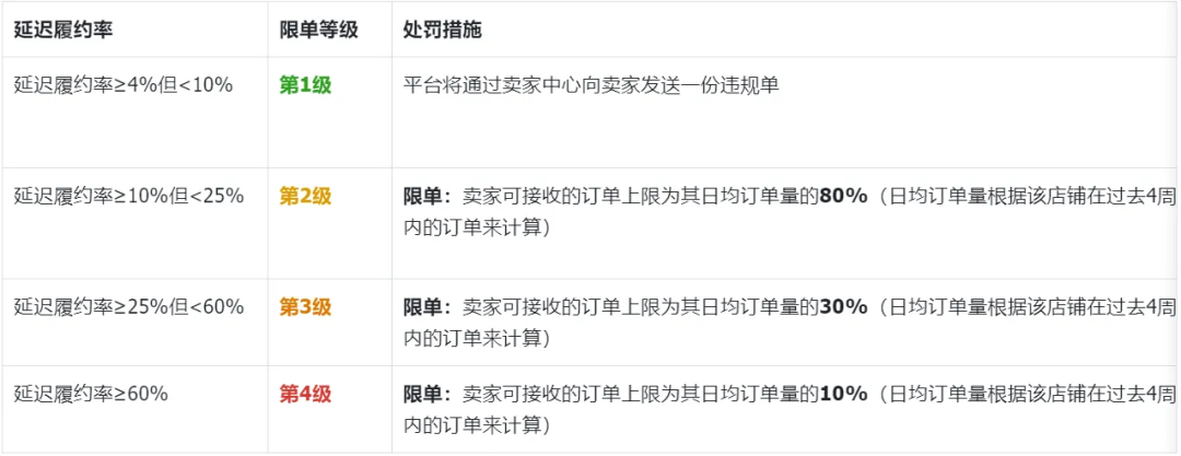 此外,平台根据卖家选择的运输类型来计算延迟履约率,并将限单措施分为4个等级。