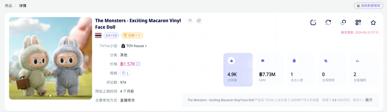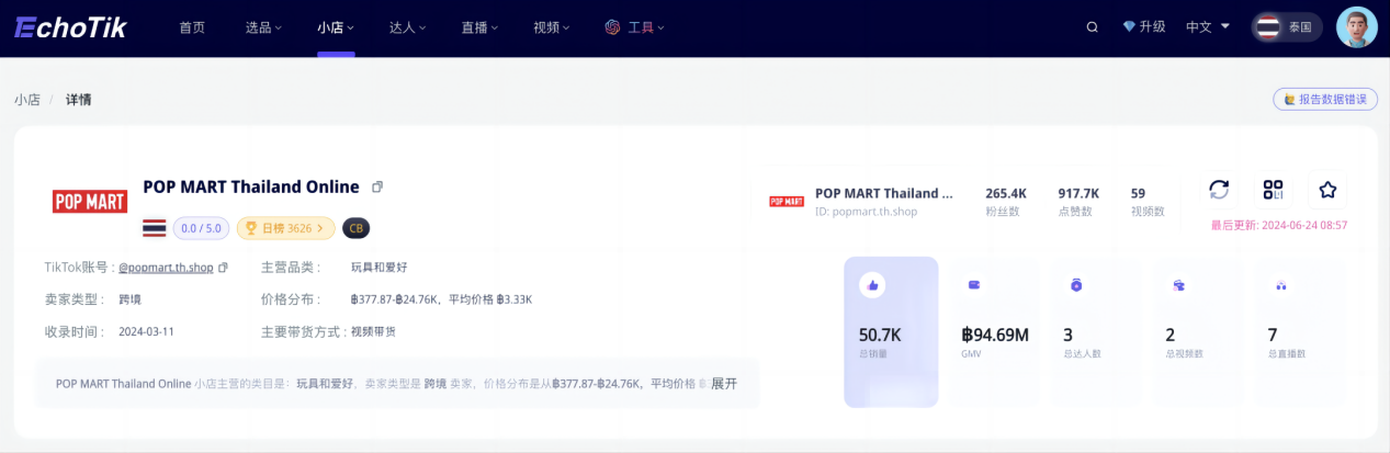 据数据平台Echotik上的资料显示,泡泡玛特的TikTok泰国小店,自今年3月份被Echotik收录以来,所监测到的总销量已经超过5万件!