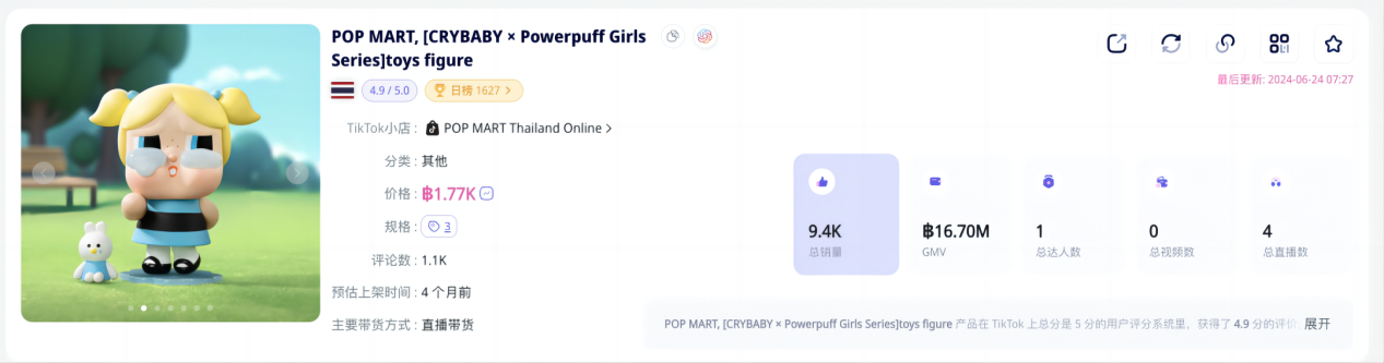 而近30天销量最高的单品是一款售价1.77K泰铢的CRYBABY飞天小女警系列,居然售出了5600件!