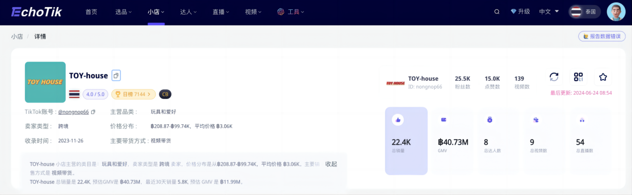 泡泡玛特这样的情况在泰国并不是个例,据Echotik数据发现,一家名为TOY-house(@nongnop66)的TikTok跨境小店,最近短时间内销量也实现了蹿升,增长至2.24万件。