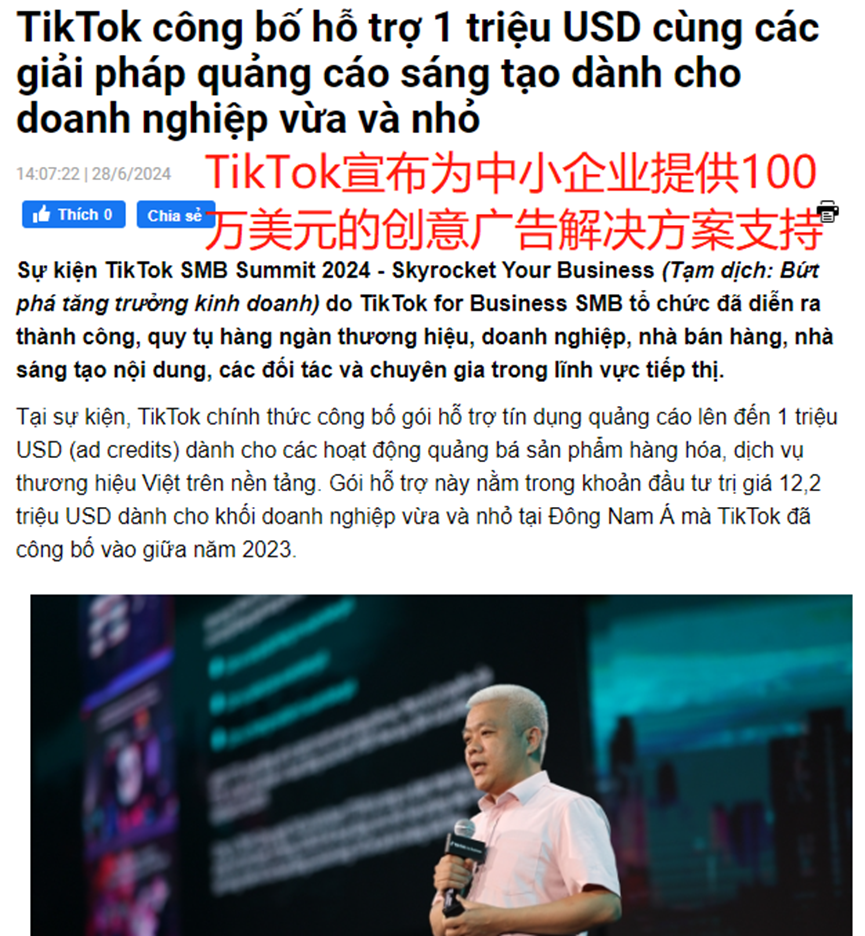 TikTok正是看中了这一市场潜力,近年来不断加大对越南市场的投入。早在去年,TikTok就曾宣布投资1220万美元,用于扶持东南亚超过12万家中小微型企业,提供现金补助、广告信贷和培训。而此次在越南推出的100万美元广告信贷支持计划,正是这一大投资的一部分,旨在进一步助力越南中小企业的发展。