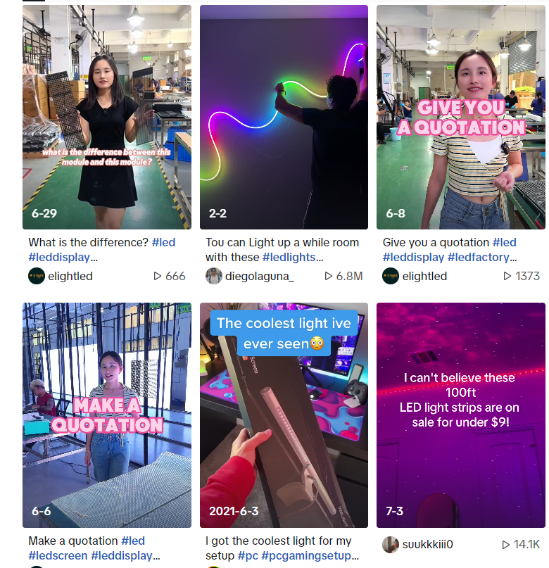 负责人:LED这个行业现在很卷,而且国内市场基本已经饱和了,想要获取更多的订单,只能是出海。而且现在TikTok很火,身边有的老板朋友都通过它出海了,所以我们就也想说试一试。没想到效果这么好,那些视频中也就是简单展示了我们LED屏幕的视觉效果,就引起了很多海外用户来询单。