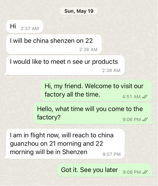最后一个因素应该就是我们的服务态度了。从最初的TikTok视频吸引客户,到WhatsApp详细沟通,再到工厂参观,我们始终保持了良好的服务态度,并赢得了客户的信任。