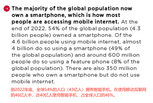 影响全球电商市场如此变化的因素有很多,比如移动互联网的普及,这让消费者可以随时随地进行购物,极大地提升了购物的便利性。而随着5G网络的逐步推广,移动电商的用户体验进一步提升,推动了更多消费者转向在线购物。据GSMA发布的《2023年移动互联网报告》可知,到2022年底,全球54%的人口(43亿人)拥有智能手机;2023年,全球移动互联网普及率持续增长,全球有57%的人口(46亿人)在使用移动互联网。