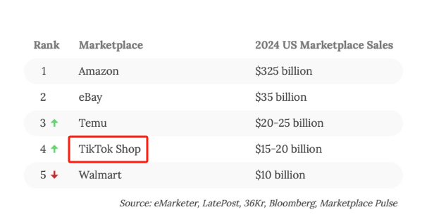 根据Marketplace Pulse的数据,TikTok Shop已经成功超越了沃尔玛,成为美国第四大电商平台。