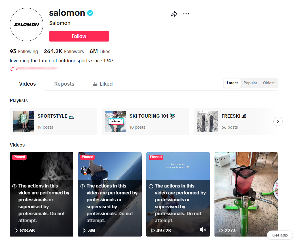 而在TikTok上,Salomon则是通过发布各种户外运动的视频,来展示产品在实际中的应用,如滑雪、越野、登山、跑步等等。将产品的专业性和时尚感通过真实体验的方式传递给全球各地的年轻用户。让Salomon的品牌形象更加立体,从而吸引了大量新生代消费者的关注和喜爱。目前,Salomon已经在TikTok积累了26.4万的粉丝,收获超过600万的点赞。