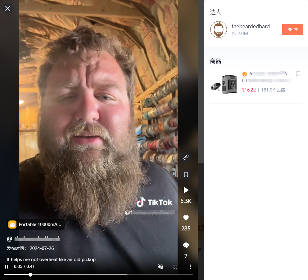 一位拥有210万粉丝的TikTok网红达人@thebeardedbard,就通过视频展示了Ruimai Technology的多功能小电扇,在视频中他表达了对小电扇的喜爱,表示小电扇很好用很方便。