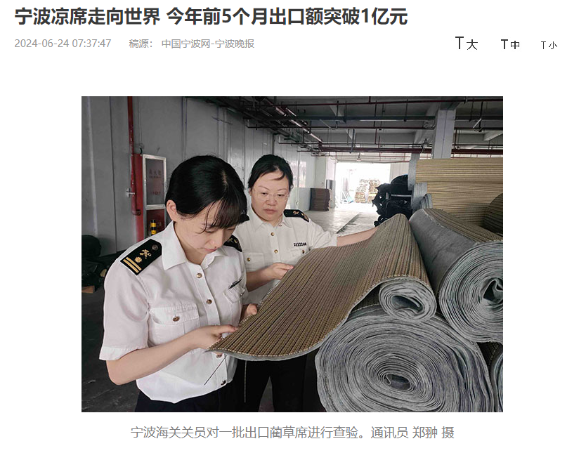 事实上,这已经不是中国凉席第一次在海外爆火了。此前中国宁波网就曾报道,今年前五个月,仅宁波市的凉席,出口规模就超过了1亿元。