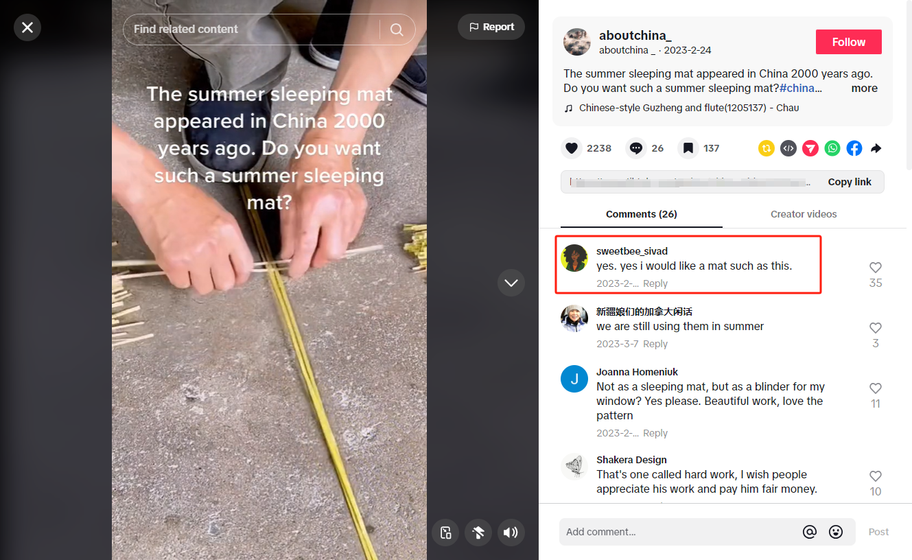 在TikTok上搜索#summer sleeping mat,可以看到大量关于中国凉席的视频,这些视频有的展示中国传统的编织手艺,有的展示凉席在日常生活中的实际应用。